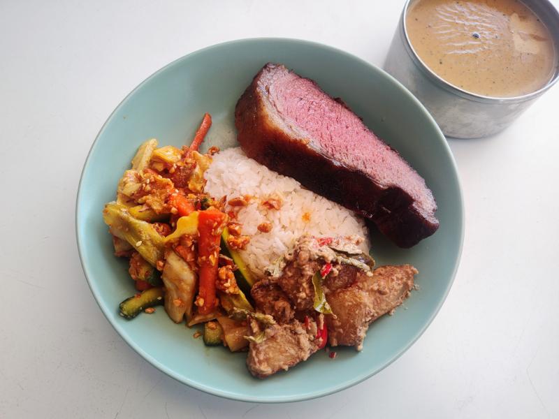 Paul made a steak using rump cap (a cut that I would never have thought would work for this purpose), while I contributed some obligatory Malaysian and Malaysian-inspired sides like a shortcut Acar, a Garlic & Butter Potatoes with chillies and curry leaves, and a shortcut coconut rice (although Paul ended up making it).
